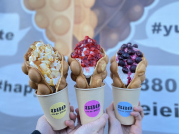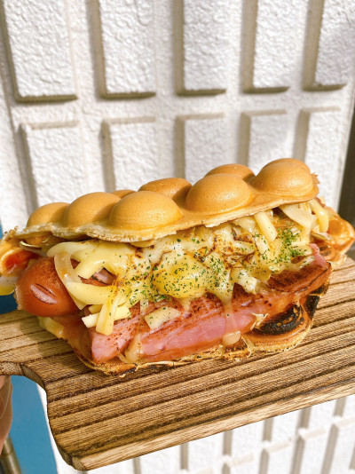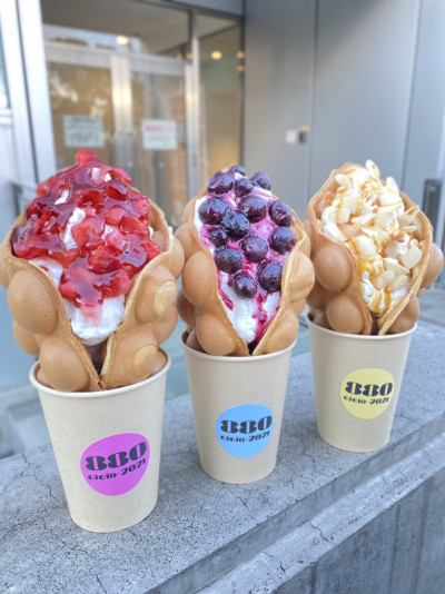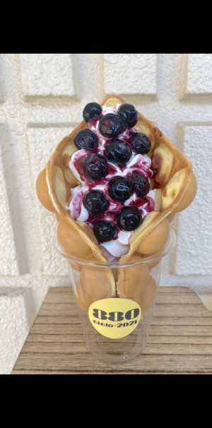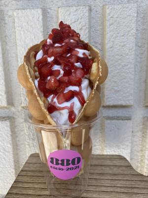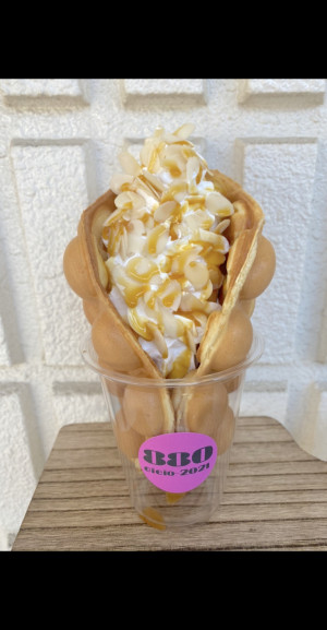 バブルワッフルとは… 香港発祥のスイーツ。生地にはタピオカ粉を使用。外はカリカリ中はモチモチ。ポコポコしていて可愛いです。インスタ映え間違いなし!!