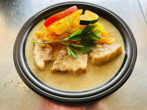 ホワイトカレーの厳選スパイスとパイナップルとミルクでじっくり煮込んだ角煮とターメリックライスにチェダーチーズをのせて炙りました!パイナップルの香りがホワイトカレーの美味しさを引き立てます!