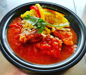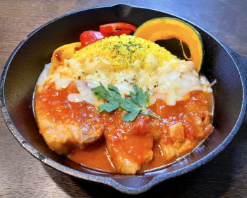 トマトでじっくりと煮込んだ角煮とターメリックライスにモッツァレラチーズをのせて豪快に炙りました!トマトとトロトロ角煮とモッツァレラチーズの最高のトリオです。