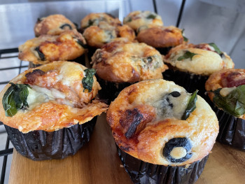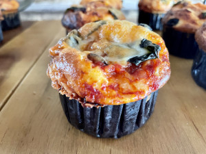 Camp×Campのオリジナルマフィンです。ゴロっとトマトの角煮をマフィンに閉じ込めました。たっぷりのモッツァレラチーズを生地の中に投入!バジルとオリーブをのせてからさらにモッツァレラチーズを!新感覚のおかずマフィンの完成です!