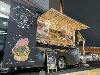 Camp×Campのキッチンカーはキャンプをテーマに、キャンプイベントやアウトドアイベントなどの雰囲気にぴったりなキャンピングカーのようなデザインです。キャンプごはんとして、角煮&チーズプレートとワンハンドで食べられる創作マフィンがメインメニューです。外で食べるとより一層美味しいメニューなので、天気の良い屋外での展示に自信があります。
