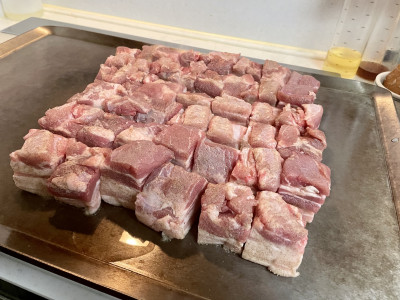 こだわりの角煮の旨みを閉じ込める為に、キャンプで使っていた極厚鉄板にて焼いています! 高温で一気に焼き上げることでお肉はさらに美味しくなります。 さらにたっぷりの時間をかけて煮込むことにより美味しさは2倍にも3倍にもなります!手間暇かけてトロトロの角煮の完成です!