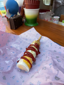 フランクフルトに何と卵焼きが巻きついた!不思議で間違いなく美味しいフランクフルトです。