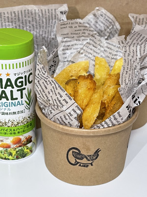生のじゃがいもから作った本気フライドポテト。黄金配合の衣を纏ったじゃがいもが、外カリサク中フワを実現しました。1番美味しい賞味期限は3分程度、すぐに食べて頂くのをオススメします。マジックソルトがクセになります。