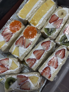 ジューシーで大きなフルーツがゴロッと入ったフルーツサンド。 甘さ控えめのホィップクリームとふわふわのパンが相性抜群! お手頃価格のフルーツサンドはおすすめです。
