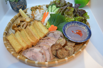 ヌクマムをかけて食べるビーフン料理。 野菜やお肉、揚げ物と具だくさんで甘辛い味付けが夏にぴったりの商品です。