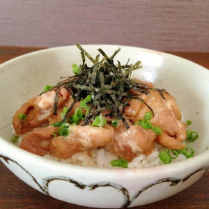 甘めのタレで味付けした焼き鳥丼、お好みで温泉卵と一緒にどうぞ!