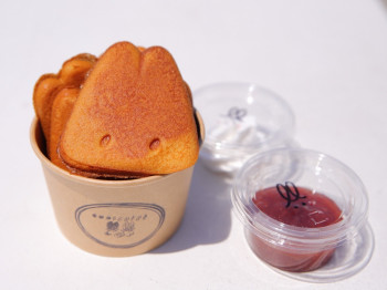 cuniculusオリジナル ウサギ型ミニパンケーキキュンキュン 片手で持てるかわいくておいしいミニパンケーキ 3個入り(ディップ1個)350円 5個入り(ディップ2個)600円 ディップなしは、1個から注文できます。