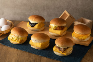こだわりの出汁を使い焼き上げたふっくら出汁巻きたまごをバンズにサンドした新感覚バーガー プレーン 500円 漬物タルタル 550円 のりたま 550円 チェダーチーズ600円 満腹すき焼き 650円 親子 700円 海老カツ 800円