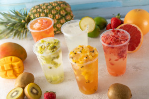 ぷるぷるナタデココ入り台湾ドリンク♪ ソーダベース 台湾レモン、キウイフルーツ、パイナップル&パッション&マンゴー、グレープフルーツ&台湾レモン、ストロベリー&台湾レモン 各600円 紅茶ベース 台湾レモン、キウイフルーツ、パイナップル&パッション&マンゴー、グレープフルーツ&台湾レモン、ストロベリー&台湾レモン 各700円