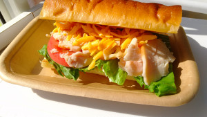 ジューシースモークチキン、レタス、トマト、マヨネーズ、マスタードとチェダーチーズにもりのこむぎオリジナルソフトフランスパン挟む