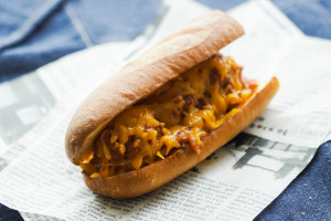 合いびき肉、マリネラソース、チェダーチーズを、もりのこむぎさんオリジナルソフトフランスパン挟んだサンドウィッチ。