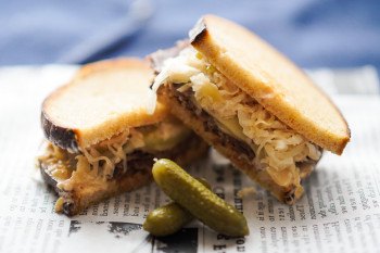 ホントのコンビーフ(缶詰ではありません)、溶かしたスイスチーズ、サワークラウトでラシアンドレッシングをアルマンドヒロの50%ライ麦パン挟んだサンドウィッチ。