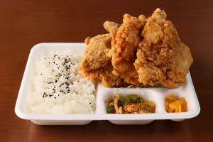 一個60グラムの唐揚げが3個ついてます。 味は旨しお味と醤油味の二種類です。 ご飯は大盛無料サービス!!