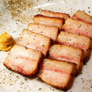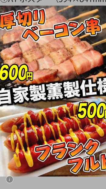 | 提供メニュー: | 自家製燻製炙りベーコン串&自家製シロップのレモネード |