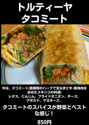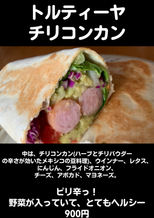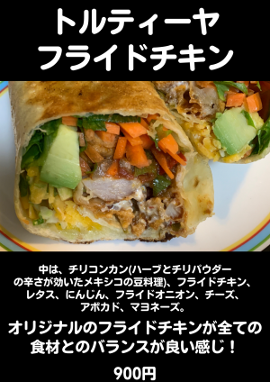 オリジナルのフライドチキンが自慢。 フライドチキンとチリコンカンの相性が良く、絶品トルティーヤです。 時には数量限定になる事も。