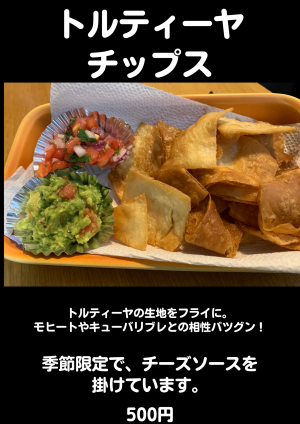 トルティーヤの生地を素揚げしたスナックです。 ディップは、オリジナルサルサとワカモレですが、冬はサルサとナチョソース(チーズ)です。