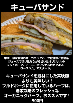 自家栽培のオーガニックフレッシュハーブと100%のライム、オレンジで漬け込み、3時間かけてオーブンで焼いたプルドポークと、自家製のピクルスが自慢のキューバサンドです。