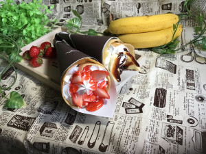 バニラシード入りの香り高いふわふわ生地。 クリームやカスタード、トッピングのアイスは乳専門店より、ソースやフルーツも厳選された素材を使用。