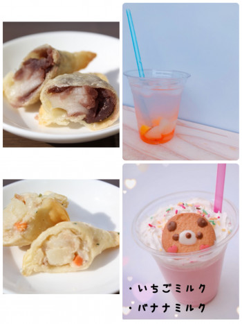 当店の人気商品、ツナポテサラ揚げ餃子、あんこ餅揚げ餃子など変わり種揚げ餃子もやっています。 桃ジュース、その他映えるドリンクなど、飲み物にも力を入れています。