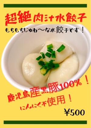 肉汁がたっぷりで、噛むとじゅわ〜っと出てきます‼️‼️溢れる肉汁でやけど注意です⚠️ 皮はもっちもち✨餡は鹿児島産黒豚を100%使用して、しっかり味を付けています🥟🌟 女性にも嬉しいにんにく不使用のこだわりの水餃子です🎵