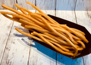 人気のロングポテトです。 揚げたてが一番おいしいので当店はオーダーが入ってから調理いたします。 約2分ほどで出来上がります。 待っている間も楽しみですね!