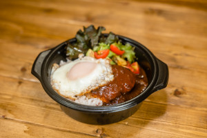 自家製手ごねハンバーグ!定番のデミグラスソースは、老若男女問わず大人気の商品です。アボカドと目玉焼きののったハワイアンプレートです。