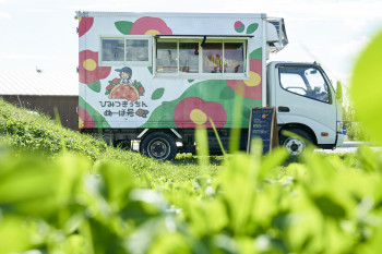 白地に椿のイラストが全面にデザインされた、明るい印象のキッチンカー。 裏側から前面にかけて、蕾が徐々に花開いていくようにデザインされていて、どの角度から見ても楽しめて、目を引く外観になっています。