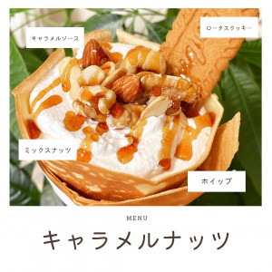 ごろごろナッツとモナンキャラメルソースが相性抜群! ロータスクッキー付きのおしゃれなクレープです。