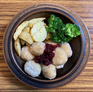 ミートボールソースと甘酸っぱいリンゴンベリーソースを添えて食べるのが北欧の定番。ボリューミーなミートボールをお楽しみください。
