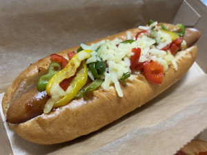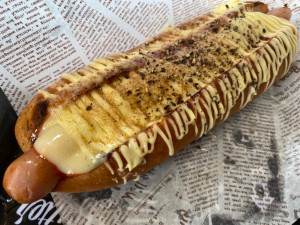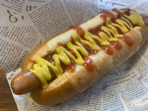 こだわりのソフトフランスパンに、約19センチ、55gのパンからはみ出るボリュームあるソーセージ。軽くトーストして提供いたします。基本形、ケチャップ、マスタード、フライドオニオン。