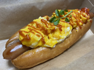 ふんわりほんのり優しい甘さのスクランブルエッグをホットドッグに乗せました。