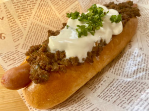 アメリカの家庭料理、スロッピージョーをホットドッグに乗せて、自家製サワークリームをトッピング。辛いのが好きな方はシラチャーソースをかけると美味です。