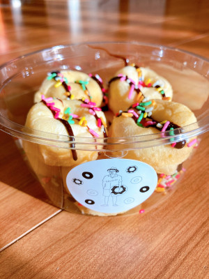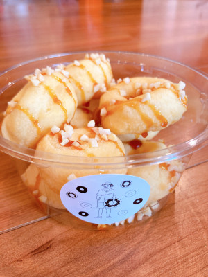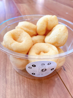 お客様の目の前で作っています! 小さくてかわいいミニドーナッツは、外はさくさく中はふんわりの食感です。 その場で作っているので、製造工程を見て楽しむことができ、あつあつの出来たてを食べていただけます。 しっかりとしたパッケージに入れてフォーク付きで提供しますので、手を汚すことなく手軽にどこでも食べていただけます。冷めてもふんわりしっとりと美味しいので、お持ち帰りにも最適です。