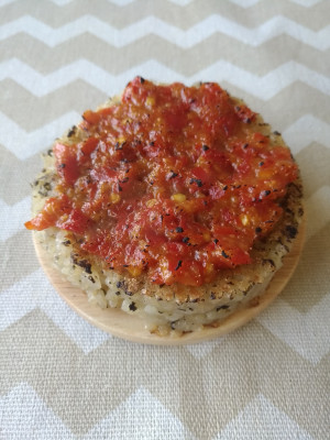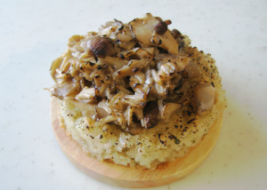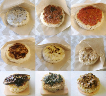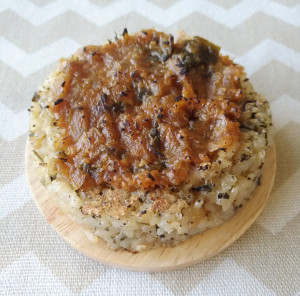狭山茶を使った茶めしの焼きおにぎりに4種のキノコをマヨネーズで炒めてのせました。 きのこの旨味が茶めしに合います。