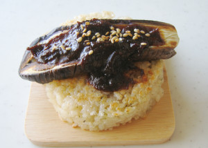 狭山茶を使った茶めしの焼きおにぎりとなす田楽のコラボレーション、懐かしい味です。