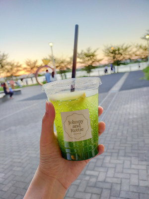 【A】抹茶×レモン、あまり見ない組み合わせかもしれませんが、これが最高に合うんです!そこにソーダが合わさって、とても爽やかなジュースになっています!鮮やかな緑色は写真にも映ます!