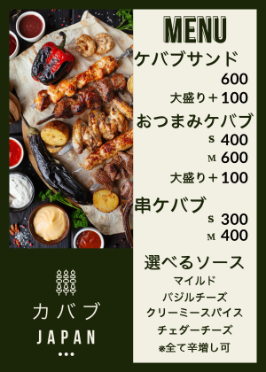 | 提供メニュー: | ケバブサンド、串ケバブ、おつまみケバブ |