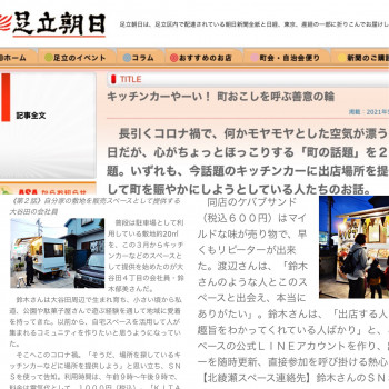平日は地域密着出店(足立区)を出店戦略とし、コロナ禍における地域活性化に取り組む様子が新聞やTVニュースに取り上げられる。 地域の方に繰り返し利用して頂いている実績と信用が強みです。 休日はお出かけ出店を重点として千葉、埼玉を中心に関東全域幅広く出店中です!