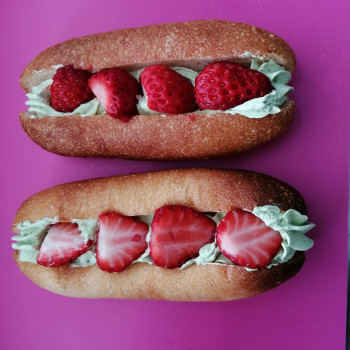 春メニューの一つフルーツドックです。ご家族連れの公園で喜ばれました。地元のいちごを使った一品です。
