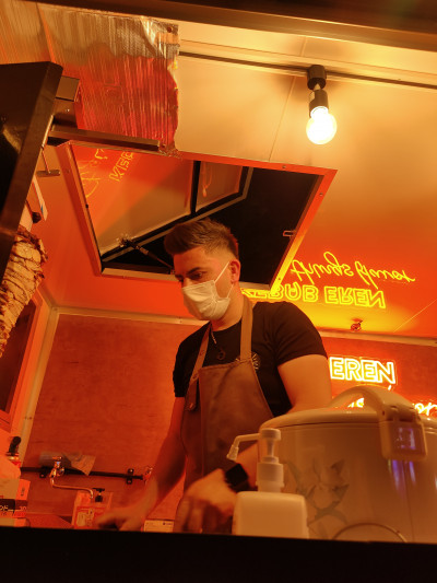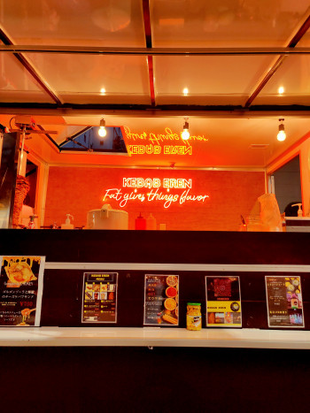 ケバブエレンはマットな黒のボディにオレンジのネオンでクールなフードトラックです。ネオンの写真など撮影するお客様が多いので、空間作りに自信あり!