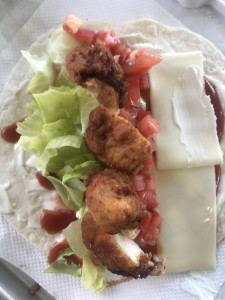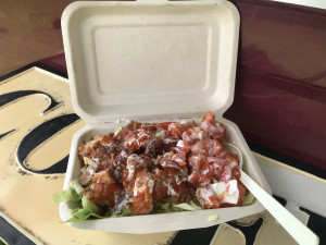ニューヨークで定番、B級グルメ、鶏胸肉、レタス、トマト、ターメリックライスのバランスのとれた美味しいさ。一度食べたらやみつきになります。
