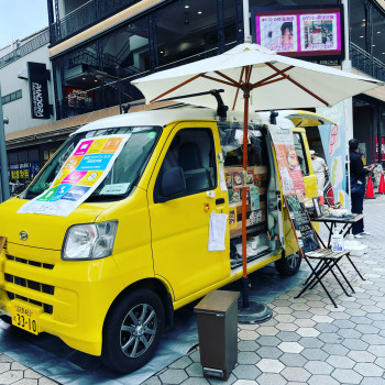 Kissan häntäのキッチンカーはとてもコンパクト!イベントやオフィス街、商業施設、どんな場所での出店にも対応可能です。黄色い車体が目を引きます!