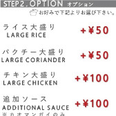 その日の気分に合わせてお好みでカスタマイズできるオプション。 ライス大盛り・チキン大盛りはもちろん、パクチー好きにはたまらないパクチー大盛りも可能。「色々な味を楽しみたい」、「ソース増し増しで食べたい」という方にはソース追加もok!一方で、「パクチーはいらない」「ライスは少なめがいい」というオーダーもok!