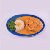 ココナッツの甘さとエビのコクが癖になるタイ風ピリ辛カレー。お米はカオマンガイ同様、鶏肉の出汁で炊いたブレンド米を使用。