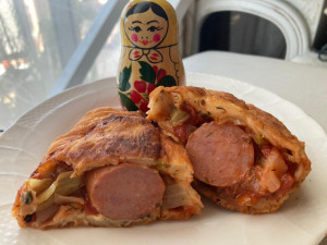 ロシア料理研究家タチヤナさん監修の元作られた、横濱もちもちピロシキ。中にウインナーとキャベツやキノコなど入れ、トマト味にした、もちもちの生地のオリジナルピロシキ。 ロシアの家庭ではオーブンで焼くのが一般的らしいですが、当店は油で焼いて仕上げます。