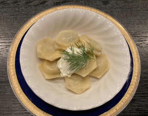 ロシアの一口水餃子。 ひき肉や刻んだ野菜を手作りの皮に包み茹で、サワークリームをかけて食べたり、スープに入れたスープペルメニなどシベリア発祥の水餃子。オリジナルのカルボナーラクリームソースはサッパリとしていて、お酒のつまみにも。