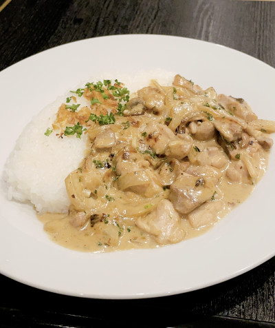 ロシア発祥のビーフストロガノフがブラジルに伝わり進化したチキンストロガノフはトマトベースに生クリーム、チキンで作るのがブラジル風。キッチンアムールはそれをまた、ロシア風の味で整えた独自の味でさっぱりした料理に仕上げました。