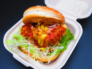 ボリューム満点のチキンにふんだんにお野菜と一緒に! どこにもない新感覚バーガー 現在も大学で大人気!