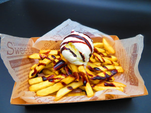 甘しょっぱさがチョコレートソースとアイスに良く合うポテトフライ。 キャラメルソースとチョコレートソースバージョンあり 病みつきになるよ